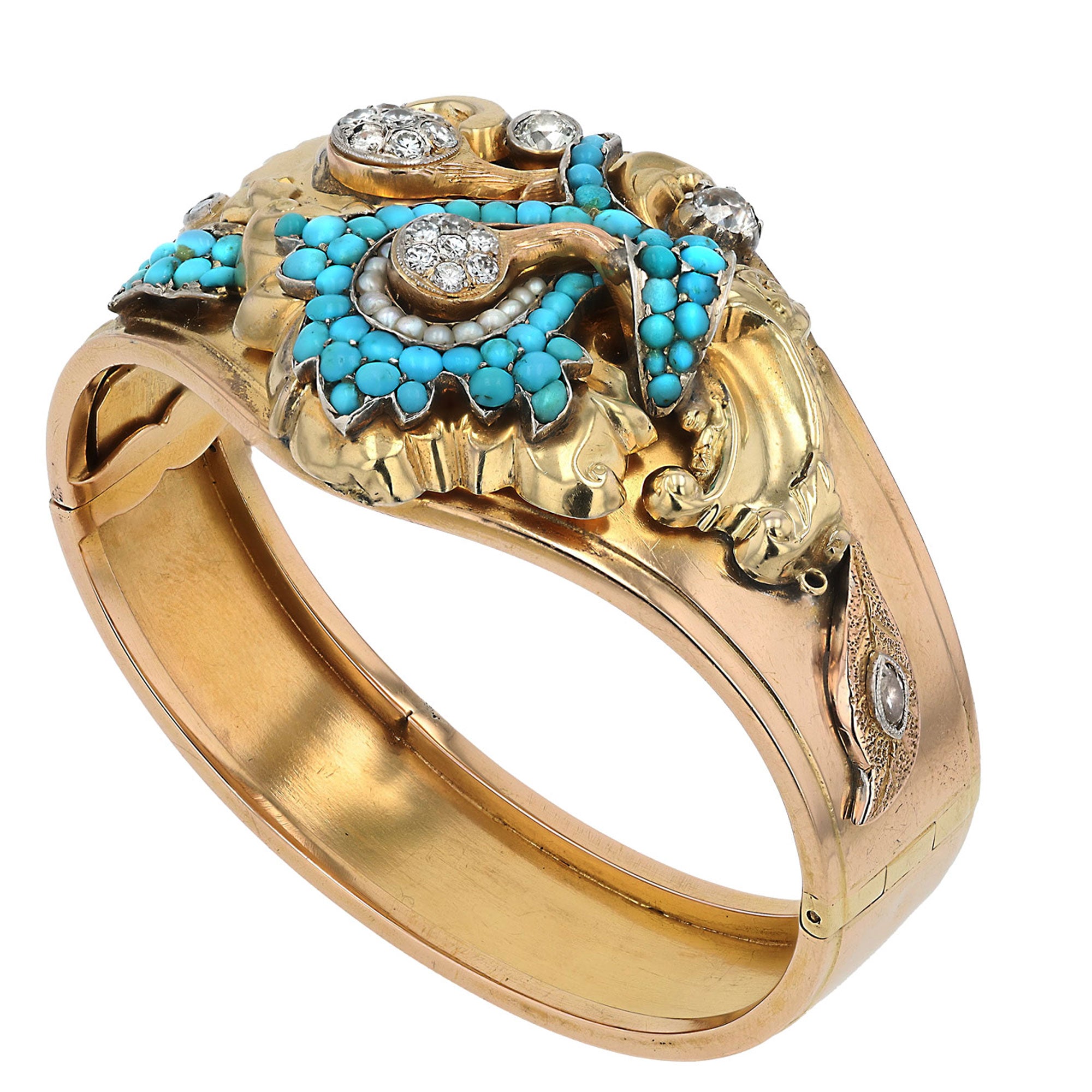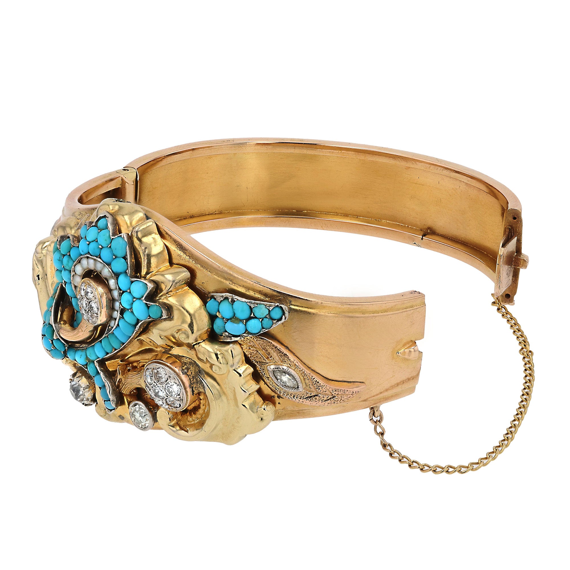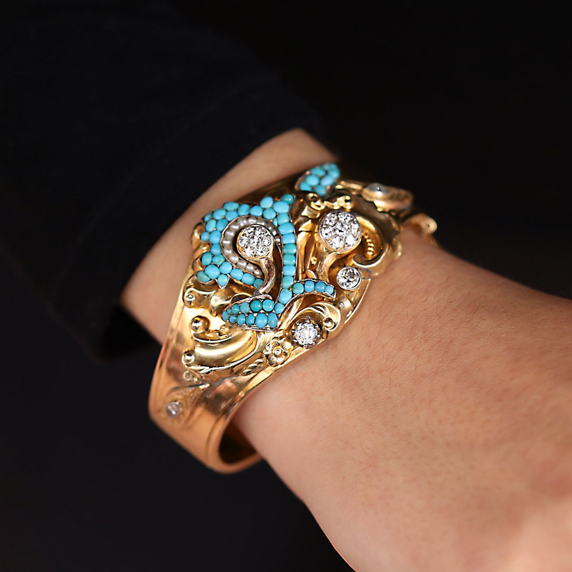 This Etruscan revival bangle bracelet, a staff favorite, is richly decorated with a scrolled motif and lively Persian turquoise and seed pearls. Further embellished with over 1 carat of antique diamonds, sparkling with old world charm. Hand fabricated of 18k yellow gold, this hinged, cuff-style bracelet is inspired by pre-Roman civilizations and the Victorian/Napoleon III era. Despite its age, this antique bracelet maintains its original patina and is in good condition.
