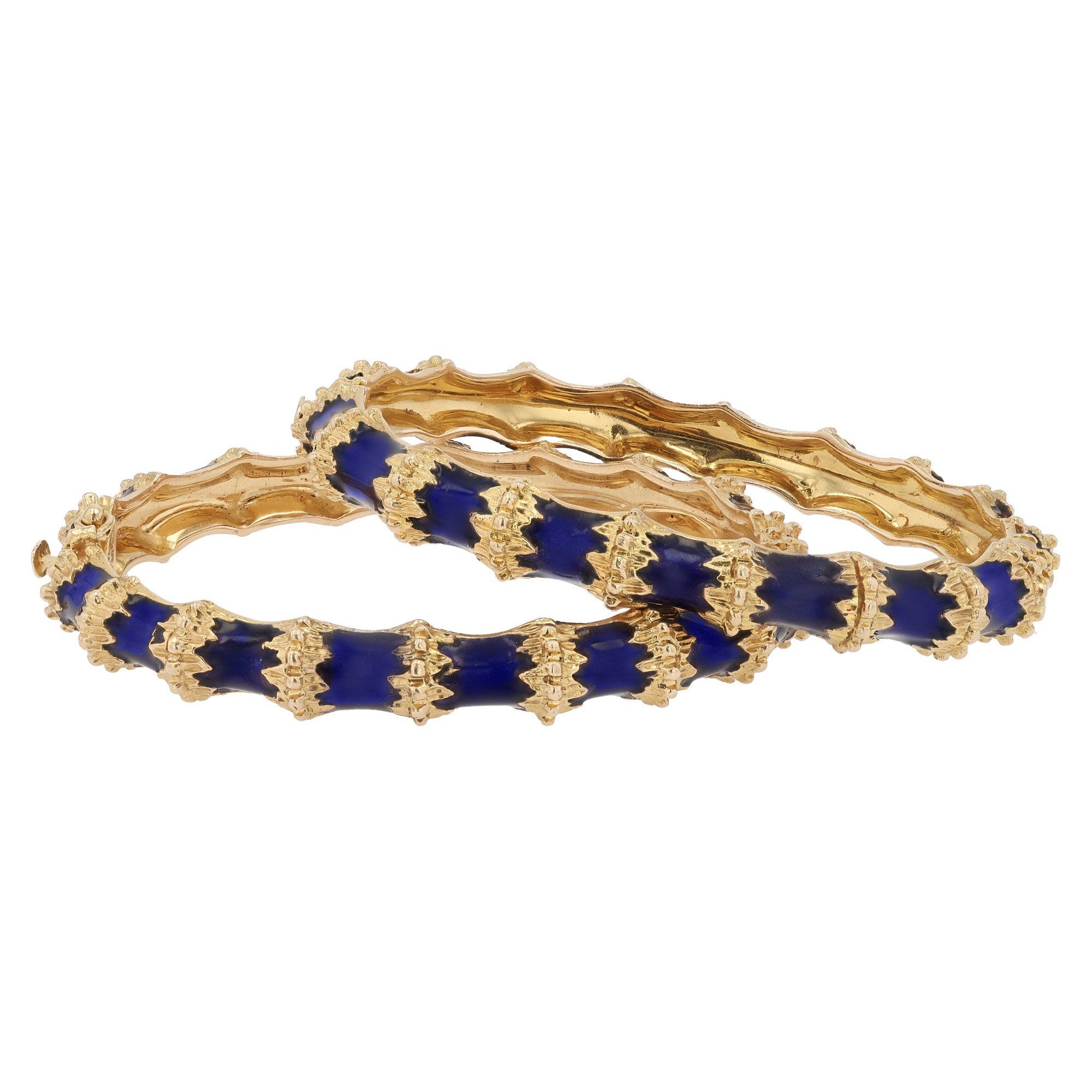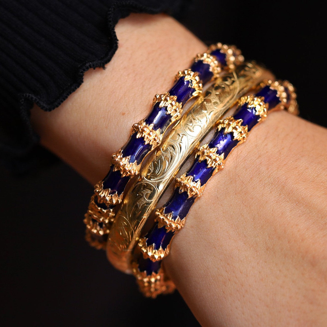 A recent acquisition is this vintage 1960's Brutalist blue enamel bangle bracelet weighing 29.7 grams in 14 karat yellow gold. Featuring an avante-gard design embellished with rich, royal blue enamel, this eminently wearable bracelet is quite versatile and lovely. One of a pair being offered for sale made by noted jeweler Jack Gutschneider. Founded in New York City in 1957, his architecturally inspired jewelry is highly sought after by collectors and was known for exquisite craftsmanship. Although he only produced for 20 years, his work remains relevant today.