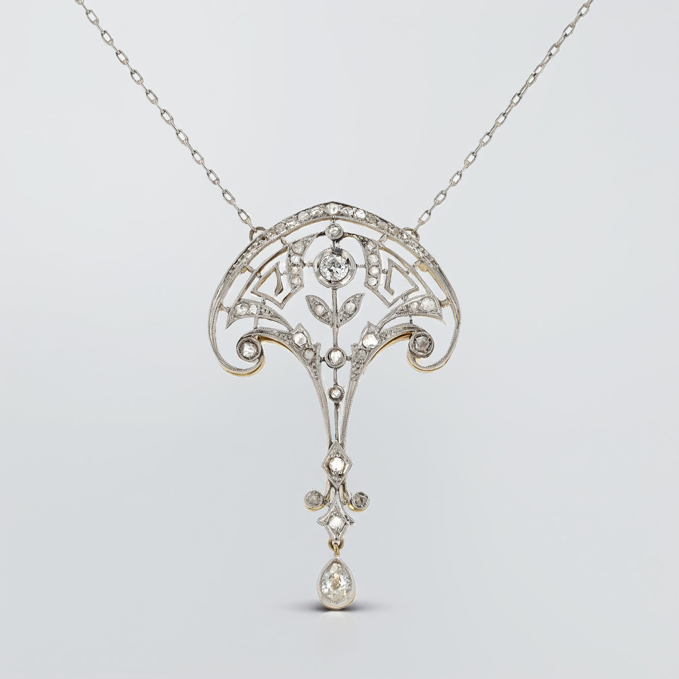 An elegant Edwardian pendant necklace perfectly executed in platinum that drapes delightfully on your neck. The lacy filigree of this Belle Epoque lavalière creates a sinuous, curvilinear floral motif contrasted by a geometric framework. Adorned with 3/4 carat of antique diamonds displaying their characteristic sparkle set within detailed milgrain borders. Crafted over 110 years ago of platinum over 18kt gold, this treasure remains in very good condition.