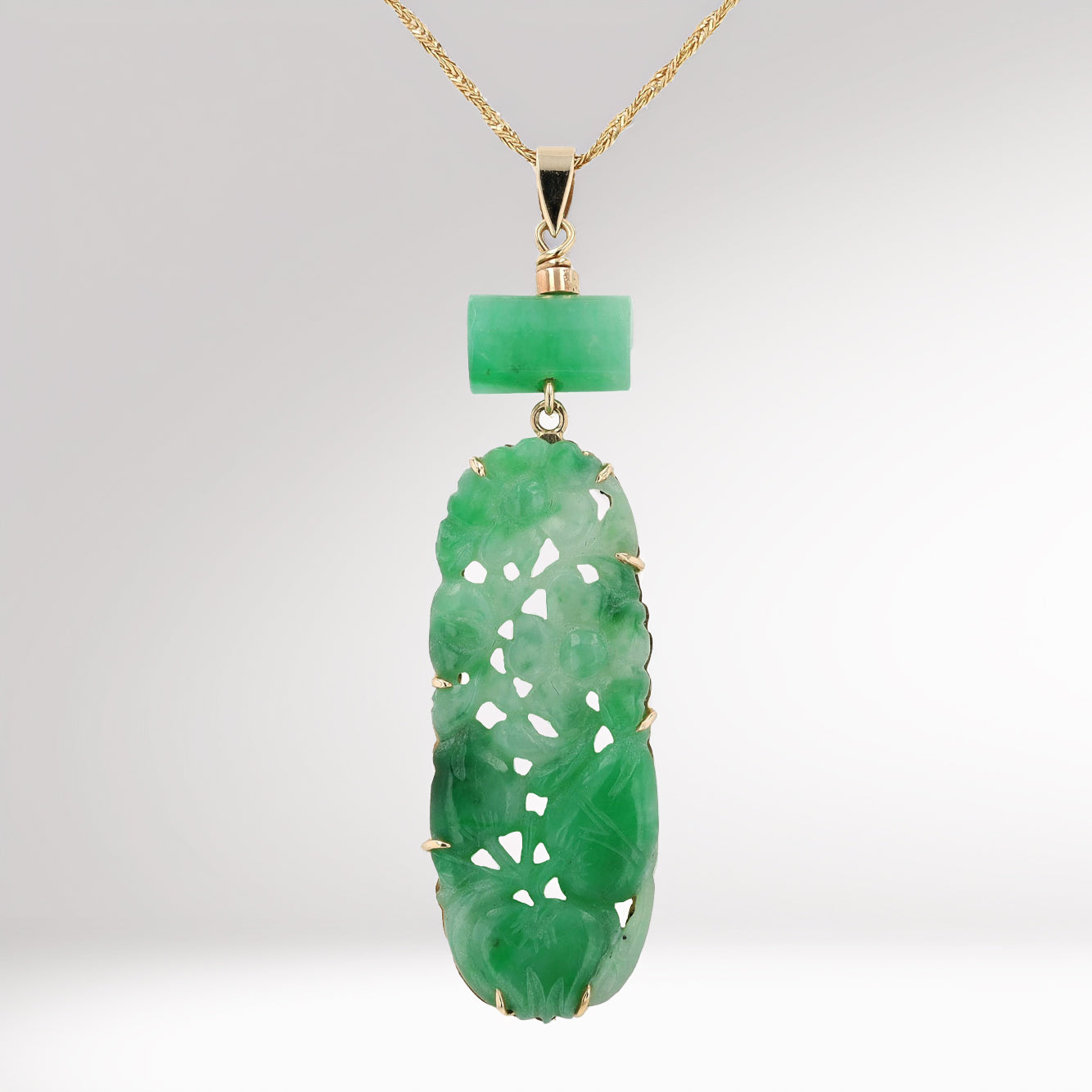 The central natural jadeite jade in this delightful drop necklace boasts a vibrant, mottled green color in an undulating oval carving. The piercings allowed their Chinese owners to sew these amulets on clothing to boast their status and wealth as well as for protection and good fortune. The carving was reimagined into a sleek lavalieré drop necklace in the 1920s by adding a single jade baton above creating juxtaposition. The 14k yellow gold chain and findings are in original condition displaying a lovely patina.